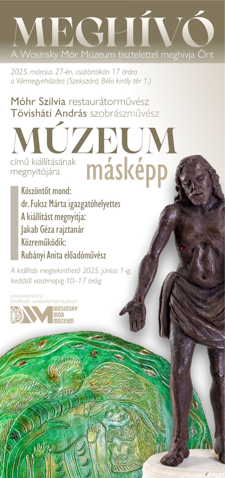 A Wosinsky Mór Múzeum szeretettel meghívja Önt 2025. március 27-én, csütörtökön 17 órára a Múzeum Másképp című kiállításának megnyitójára, ahol Móhr Szilvia restaurátorművész és Tövisháti András szobrászművész, a múzeum munkatársainak alkotásaiból nyílik bemutató.