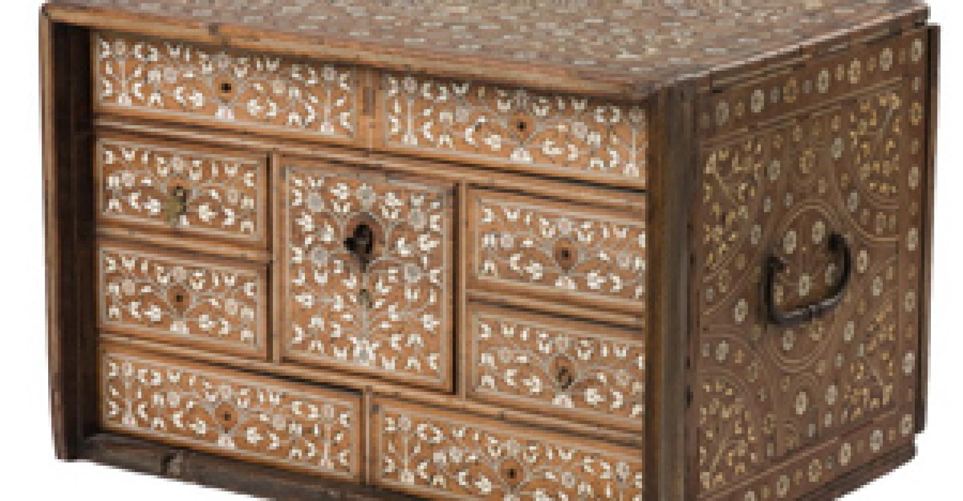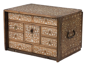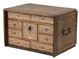Ládika a kazettánál nagyobb, de a ládánál kisebb, le vagy felhajtható lappal esetleg ajtóval nyíló, olykor kengyeles fülekkel ellátott tároló alkalmatosság, íróeszközök, iratok, varróeszközök, ékszerek, pénz és egyéb apróság befogadására olykor elrejtésére szolgált. Művészi igénnyel készülnek, felületükön gyakran találkozunk bibliai jelenetekkel, ha jegyajándékok, akkor szerelemre utaló ábrázolásokkal. A diófa ládika egész felületén igen finom csontberakásos növényi díszítmény látható. A lenyíló előlapja hiányzik. Belül nyolc fiókkal körbefogott nagyobb négyzetes fiók van. A doboz két oldalán kovácsoltvas emelőfülek. A leggazdagabb díszítést a ládika tetején látjuk. A téglalap szélén körben kettős csík között kisebb-nagyobb rozetták váltakoznak. A téglalap négy sarkából kiindulva kicsiny vázából kinyúló virágcsokor látható, melyet köríves kettős csík berakás zár le. A lap közepén tulipánokkal és rozettákkal körülvett körben kisebb-nagyobb rozetták váltakoznak kettős csík között. Legbelül középen kicsi vázából kinövő virágcsokor tölti ki a kört. A láda kengyeles fülekkel ellátott két oldalán hasonló mintázatot találunk. Az előoldalon minden fiókon leveles rozettás indázó virágcsokrok láthatók. A gömbpanorámán látható ékszerláda az Iparművészeti Gyűjtemény 1961.76.1. számú darabja. Német, 18. század vége, diófa, csontberakással. Magasság: 27 cm, szélesség: 40 cm, mélység: 30 cm