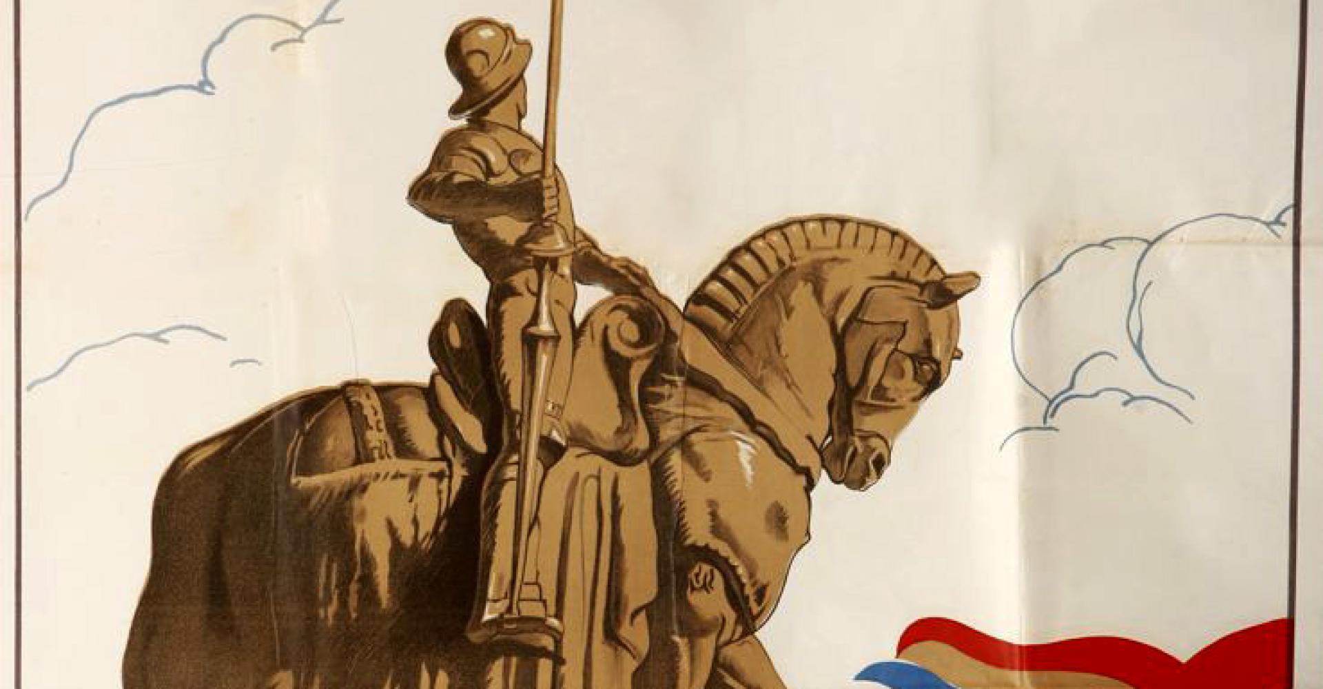 Mátyás-korabeli páncélos vitézt ábrázoló lovas szobor, Sidlo Ferenc szobrászművész által tervezett, 1915 szeptemberében Budapesten, a Deák téren felállított faszobornak a kicsinyített, spiáterből öntött másolata. A talapzat két oldalán felirat látható. Egyiken Gyorssegély Auguszta Alap, a másikon A Hadsegélyező Hivatal.