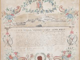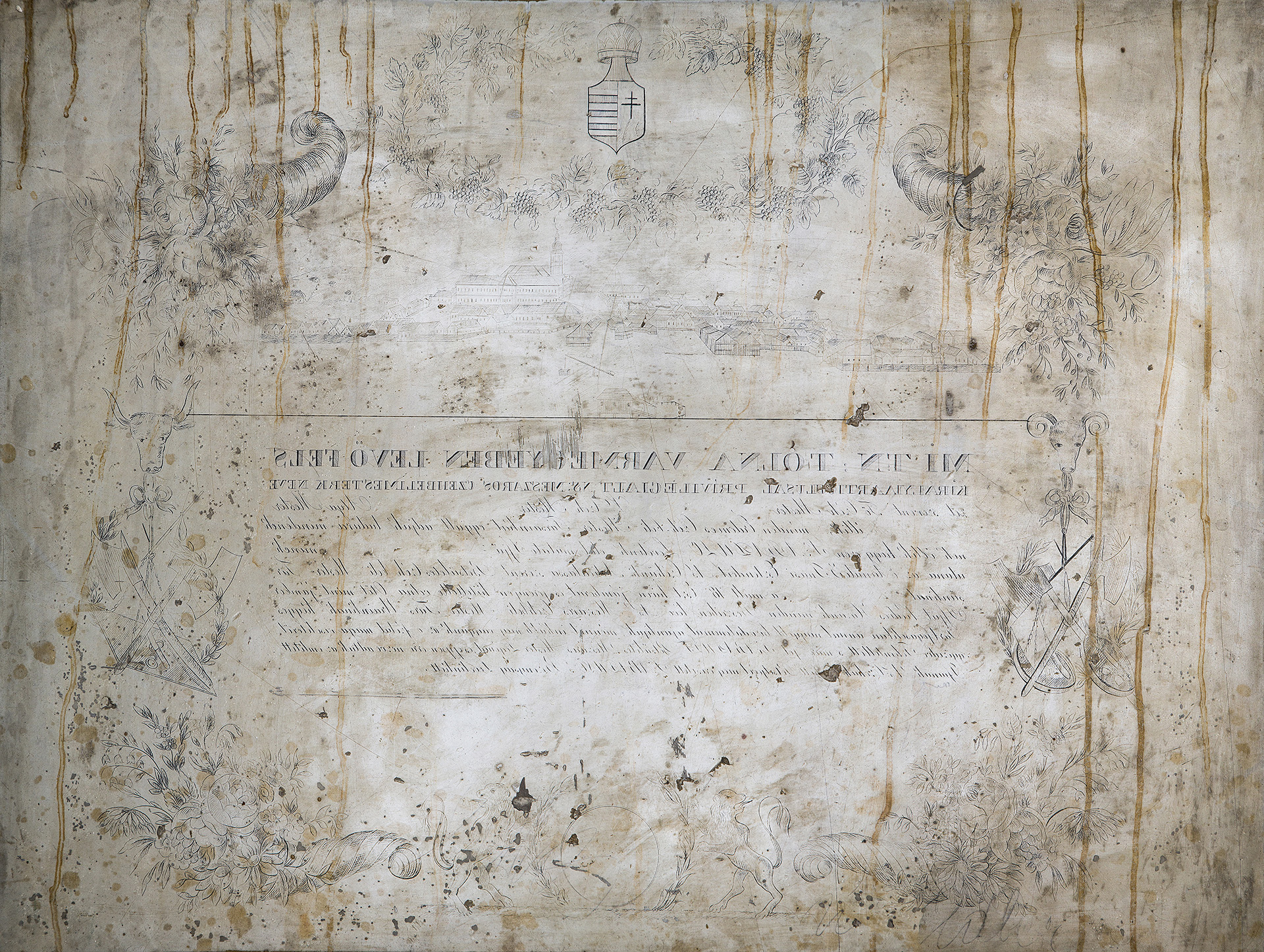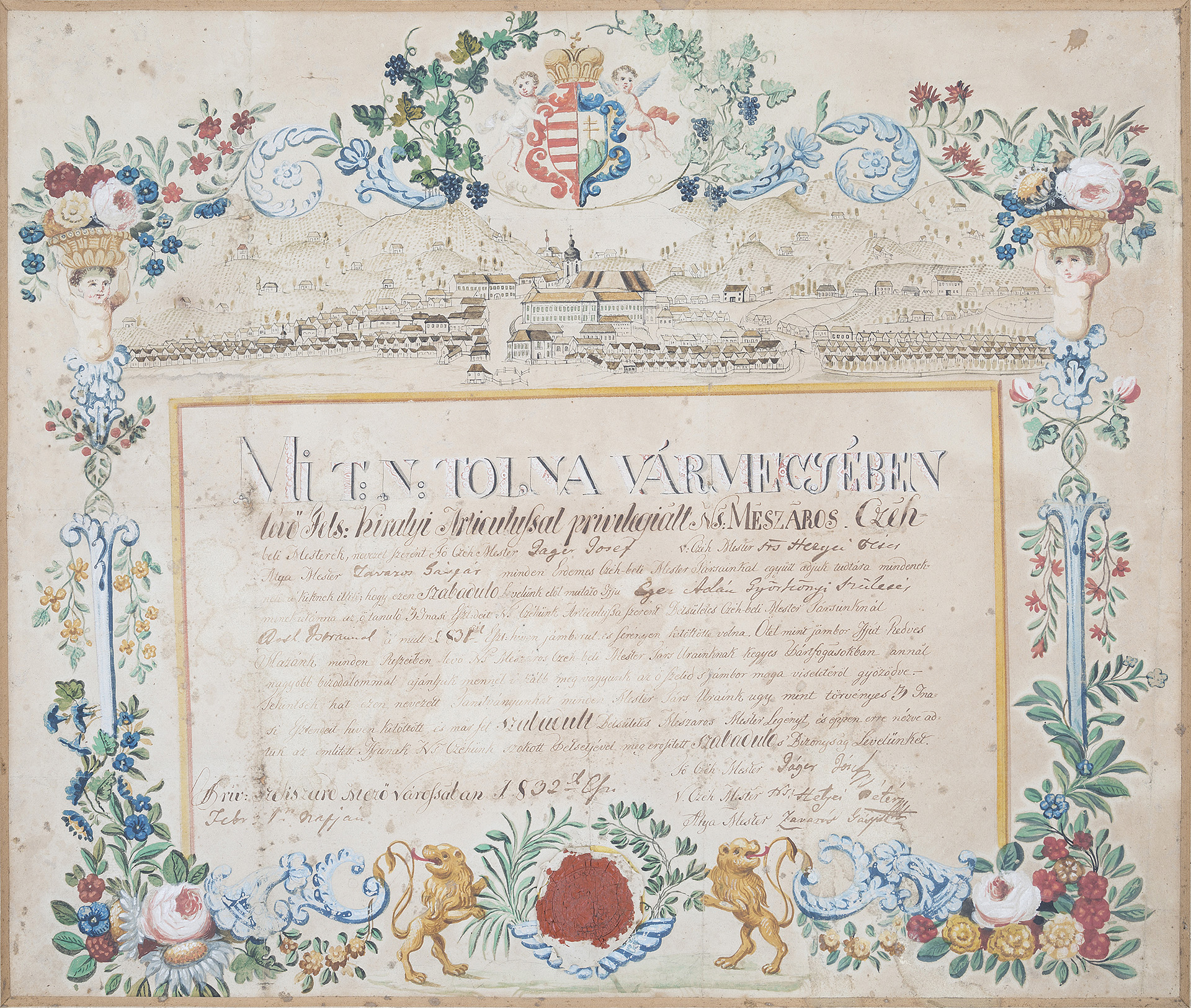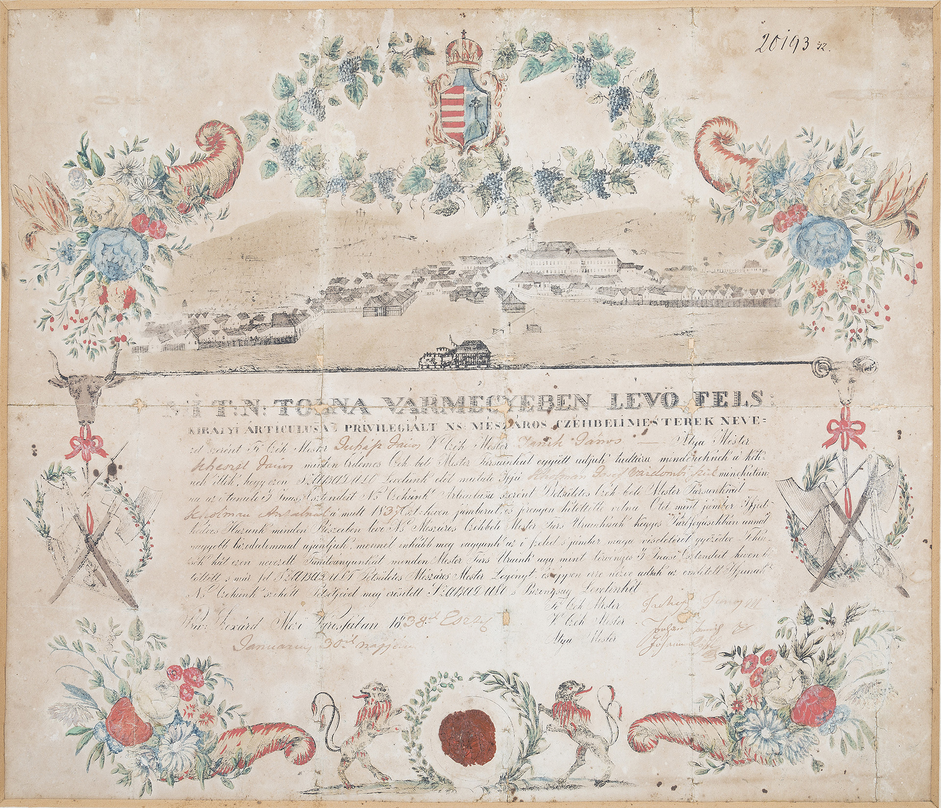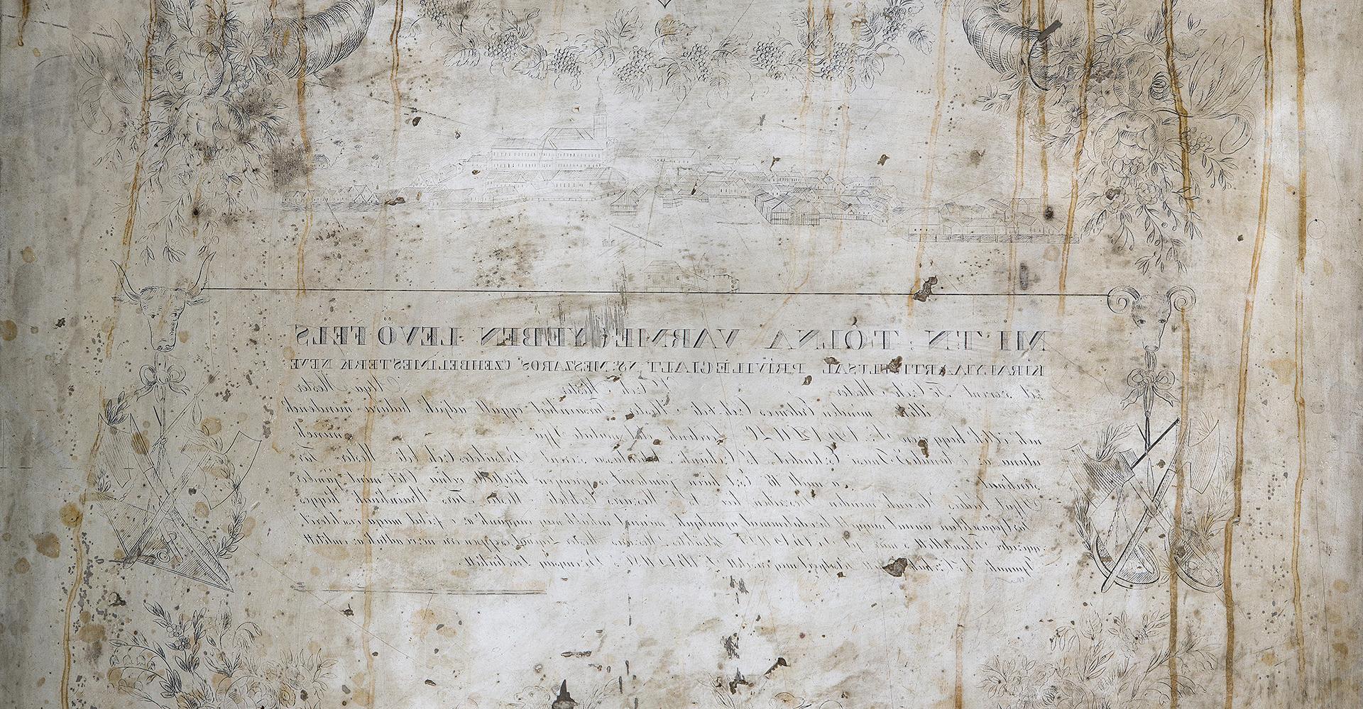 Néprajzi gyűjtemény Leltári szám: 61.22.1. Méretek: hosszúság: 67 cm, szélesség: 52 cm, magasság: 9,5 cm A céh az azonos szakmát folytató kézművesek érdekvédelmi szervezete volt a feudalizmus korában. Végső felszámolásukra csak 1872-ben került sor. A céhes ipartörténet korából rengeteg tárgyi emlék maradt fent, melynek egyik különleges példánya a márványból faragott litográf negatívkő (1. ábra), mellyel a szekszárdi mészáros céh mesterlevelét nyomtatták az 1830-as években. A kövön látható szöveg tanúsága szerint a Tolna megyei „nemes mészáros czéhbeli mesterek”adják „tudtára mindenkinek, akiknek illik”, hogy céhlegényüket felszabadították, azaz önálló mesterré avatták. A mesterré válásnak a céhek fennállása alatt mindig nagyon szigorú feltételei voltak. Az inasként és legényként eltöltött sok éves tanulás, a külföldön való vándorlás és tapasztalatgyűjtés után tudásukat bizonyítandó vizsgát tettek - úgynevezett céhremeket készítettek – a legények a mesterek előtt. A mészárosok esetében ez a szarvasmarha szakszerű levágásából és feldarabolásából állt. A Tolna megyei egyesült mészáros céh 1749-ben alakult meg. Erről tanúskodik a céhlevélen látható pecsét (2. ábra) is. A korábban kézzel írt mesterleveleket váltotta fel a litográf márványkővel való sokszorosítás lehetősége. A litográf eljárással történő kőnyomtatás a Münchenben élő Alois Senefelder nevéhez fűződött, aki az 1790-es évek végén találta fel és dolgozta ki az addig nem ismert új nyomtatási technológiát. A bonyolult kémiai reakciókra alapozott eljárás során – mely a víz és a zsír kölcsönös taszító tulajdonságára épült – mind a nyomó-, mind a nyomtatandó felületet kezelték, és ezáltal befolyásolták a papír festékfelvevő képességét. A litográfiai nyomtatás kezdetekor kőtáblákat, márványtáblákat használtak nyomófelületként. Igazi mestermunkának számított a márványtábla kifaragása, az aprólékos díszkeret elkészítése, illetve a tükörírással megírt szöveg kivésése, mely a nyomtatás után lett balról jobbra olvasható. A litográf negatívkő pontos korát nem ismerjük, de egyéb források segítségével megállapíthatjuk, hogy valamikor 1832 és 1838 között keletkezhetett. A múzeum gyűjteményében 1832-ből származik a legkorábbi, kézzel írt és díszített mészáros mesterlevél (3. ábra), majd 6 évvel később már a nyomtatott (2. ábra) szabaduló levelet használta a céh, melyet az addigra elkészült litográf negatívkő segítségével készítettek. A mesterleveleken felfedezhetőek a korszakra és céhre jellemző formai követelmények, melyek között számos apró eltérést is találhatunk a részletesebb vizsgálódás során. A nyomtatással készült szövegen (2. ábra) látszik, hogy a személyes adatok helyét (nevek, helységek, időpontok) üresen hagyták a márványkő faragásakor, és minden alkalommal kézzel töltötték ki. A szövegek körüli gazdagon díszített keret jellemző motívumai a címer és a hozzá tartozó angyalok, a virágkompozíció, a bőségszaru, a céhpecsét körüli növénykoszorú oroszlánokkal és drapériával. Szekszárd – mint híres borvidék esetében nem véletlen – hogy a címert szőlőfürtös koszorú veszi körül. Szinte kihagyhatatlan az adott céhre jellemző tárgyak, mesterségbeli eszközök megjelenítése. A mészárosok esetében főként az ökörfej, a bárd, a kés, a mérleg jelképezte a szakmát, melyek a hivatalos céhpecséteken is helyet kaphattak. Külön figyelmet érdemel Szekszárd mezőváros látképe, mely az 1830-as állapotokat tükrözi. A litográffal elkészített fekete színű nyomtatás után kézzel festették ki a képet, illetve rárajzolták a hiányzó részeket. Szekszárd város szimbólumait jelenítették meg mindkét mesterlevélen: a szőlővel borított dombvidéket, a présházakat, de a legjelentősebb épületek is helyet kaptak, mint a vármegyeháza, a katolikus templom, (az 1832-es mesterlevélen a református templom is), a legelő szélén álló marhavágóhíd, valamint a Bartina-hegyen álló három kereszt. Az aprólékosan kidolgozott 1832-es mesterlevélen a három kereszt között még a két szobor alakzata is látható. A litográf kő, mint műtárgy történetét csak részleteiben ismerjük. 1961-ben Babus Jolán – a múzeum akkori munkatársa – talált rá a kőre a Mérey utcában. Az emeletes Boda-présház (4. ábra) földszinti részének verandájába volt befalazva. A ház ekkor már dr. Schneider Zoltán szekszárdi szakorvos tulajdonában volt, aki a múzeumnak ajándékozta a követ. Tóth István – szintén a múzeum régi munkatársa, állandó ásatási munkása – véste ki (5. ábra) és hozta be négykerekű kiskocsin (6. ábra) a körülbelül 60-70 kg-os márványtáblát, mely azóta gazdagítja a néprajzi gyűjteményt. Szöveg: Fuksz Márta Grafika: Sági Apollónia Fotó: Retkes Tamás   Felhasznált irodalom:   ÉRI István - NAGY Lajos - NAGYBÁKAY Péter (szerk.): A magyarországi céhes kézművesipar forrásanyagának katasztere. I—II. Budapest 1975-76. Dr. GARA Miklós (szerk.): Nyomdaipari enciklopédia. Budapest, 2001. SELMECZI KOVÁCS Attila: Mészáros- és hentesipar. In: Magyar Néprajz III. Kézművesség, Budapest, 1991. 214-220. Dr. SZILÁGYI Mihály: Szekszárd a kései feudalizmus korában (1686-1847). In: Szekszárd város történeti monográfiája, Szekszárd, 1990. 95-208.208. 2. ábra (WMMM Történeti gyűjtemény) - Tolna megyei mészáros céh mesterlevele 1838. 3. ábra (WMMM Történeti gyűjtemény) - Tolna megyei mészáros céh mesterlevele 1832. 4. ábra (Néprajzi gyűjtemény) - Boda présház (Dr. Schneider Zoltán háza) 1961. 5. ábra (Néprajzi gyűjtemény) - 