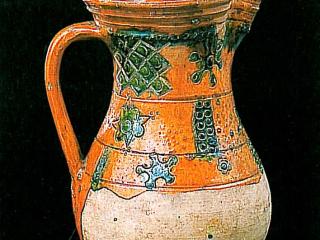 A mezőváros közepe táján feltárt gödörből kerültek elő a most bemutatandó darabok. Egy sárgásfehér anyagú, a száján, nyakán, részben a hason színes (sárgásbarna és zöld) mázzal borított felületű edényt láthatunk. A nyakon és a vállon még égetés előtt bekarcolásokkal különítettek el sávokat, amelyek közötti részt különböző színű mázzal öntöttek le. Így nem folytak össze a különböző színű mázak. A hason is bekarcolással különítették el a mázas és a mázatlan részeket. A nyakon bepecsételt koncentrikus köröket, íves ágú fa formájú mintát, valamint egy négyzetben kereszt ábrázolást láthatunk. A vállon szintén dupla bordás szélű négyzetben szarvasábrázolást láthatunk. A nyakon és a vállon is a függőleges sávokban lévő koncentrikus körök, a fa formájú minta és a négyzetben lévő bepecsételt minta szabályos sorrendben ismétlődik. A töredékek formája alapján reneszánsz díszedény, kancsó lehetett ez a tárgy.