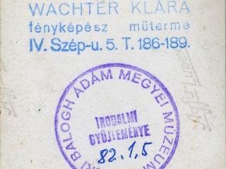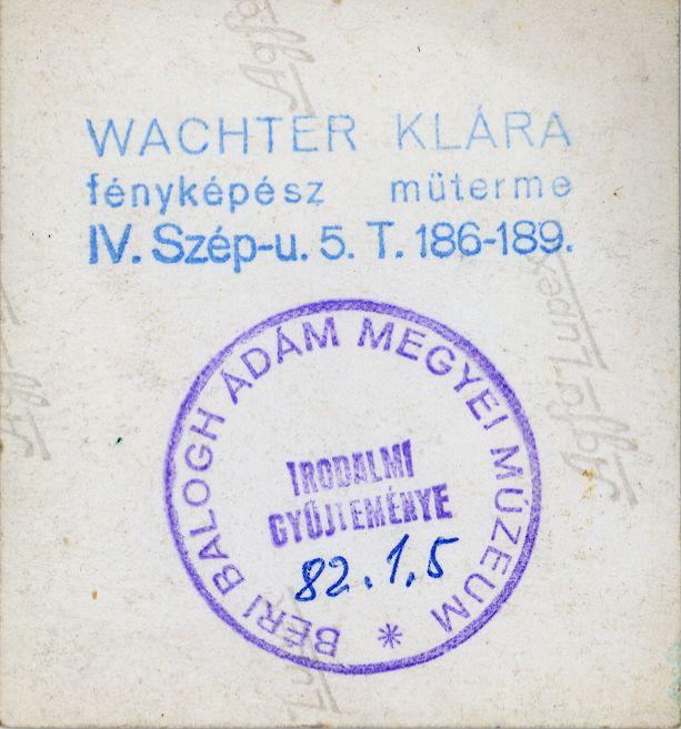 Ebből a szövegrészből tudjuk meg, hogy a leltárkönyvi bejegyzés szerint az egyik fotón szereplő Wachter Károly, a fotós édesapja, Szekszárdon közismert lehetett. A Tanácsköztársaságot követő időszakban 1920-ban járásbíróként dolgozott. A minisztertanács 1929. január 4-i ülés jegyzőkönyve megemlékezik arról, hogy a Szekszárdi Királyi járásbíróság alelnökévé nevezték ki. 1938. november 4-i MTI híradás szerint az akkor már nyugalmazott bíró agyszélhűdésben elhunyt, tehát a fotók elkészítése után pár hónappal. Pozíciója is közbejátszhatott Babitsékkal történő kapcsolatához, hiszen a költő 1898-ban elhunyt édesapja szintén táblabíró volt előbb Szekszárdon, majd Pécsett. Wachter Károly veje 1945 zűrzavaros tavaszán hadbíró szerepet vállalt. A szöveg másik érdekessége az, hogy Wachter Klára fotózása közismert volt Szekszárdon az 1930-as közepén és egyebek mellett művészi (akt) képekkel is próbálkozott. A Tolnamegyei Újság 1934. májusában arról számolt be, hogy fotósunk szerepelt a Kaszinó kerthelyiségében létrehozott „országos művészi amatőrfényképkiállításon” és a zsűri a képeit külön kiemelte. Újkortörténeti gyűjteményünk közel 60 képet őriz az 1930-as évek közepéből, változatos témákat dokumentált Szekszárd életéből. Fotózta a Béla király téri és a múzeum melletti marhavásár pillanatait, portréi jellegzetes figurákat őriznek meg. Valamikor a 30-as évek közepén költözött Budapestre és megnyitotta belvárosi fényképész műhelyét. Itt a megélhetését biztosító műhelyfotókon kívül készített képeket a város épületeiről, de pl. 1945-ben részletesen végigfotózta a félig romos Vajdahunyadvárat is, amelyek segítették az épület helyreállítását.
