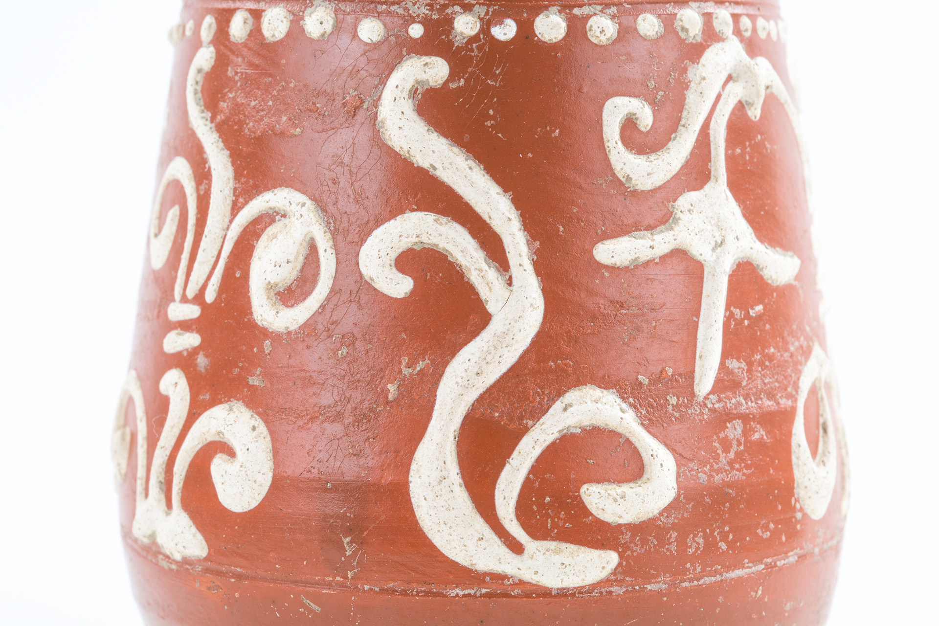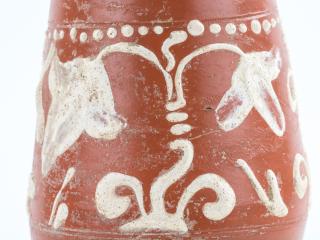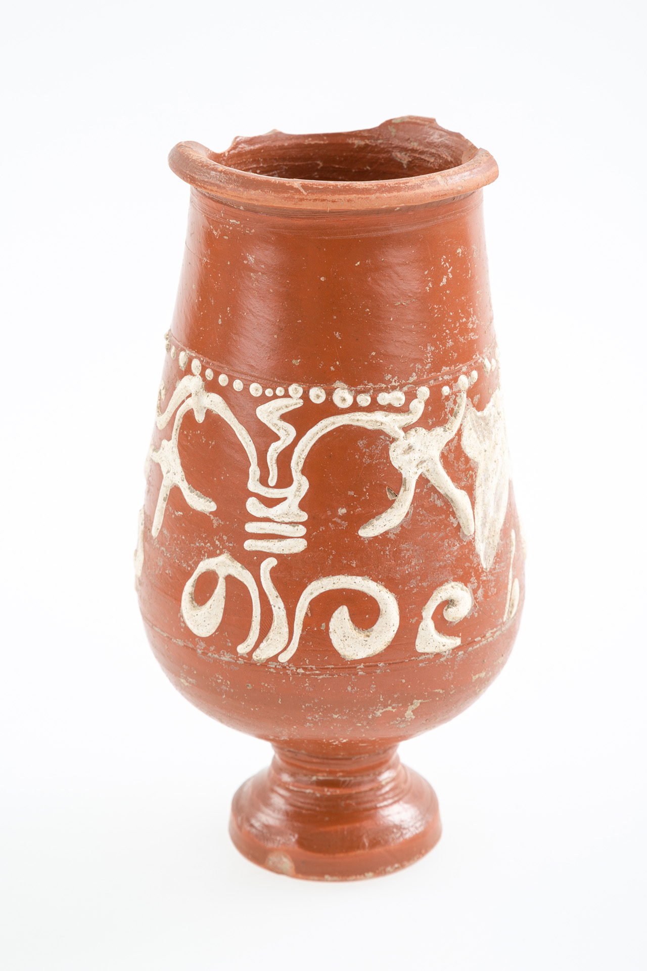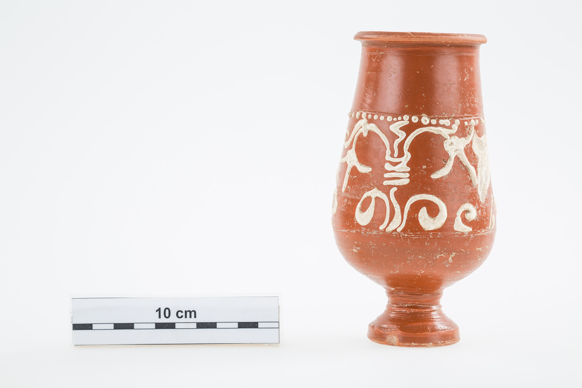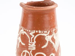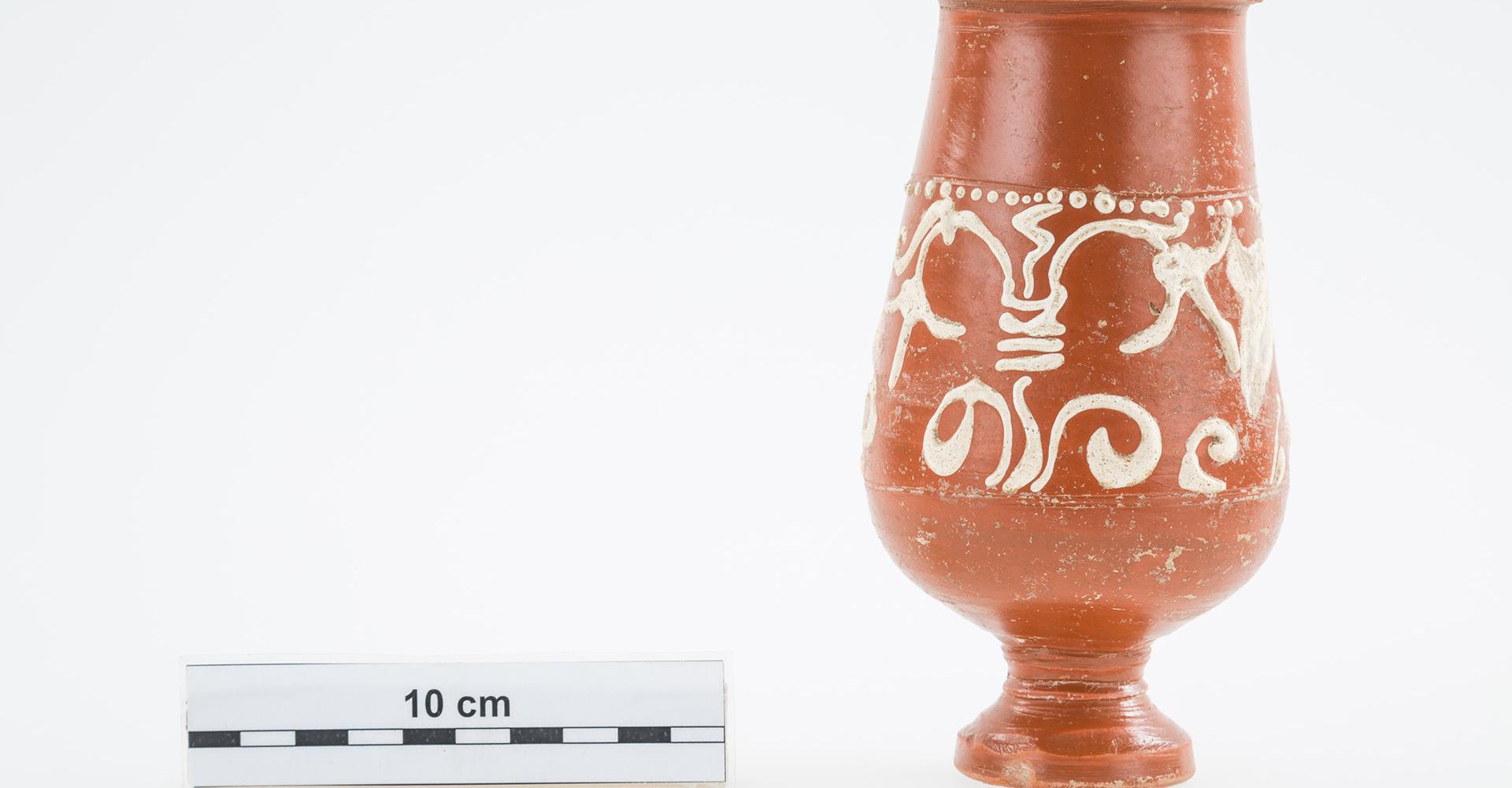 Barbotindíszes terra sigillata talpas serleg   Régészeti gyűjtemény, leltári szám: 2017.3.1. Méret: magasság:15,5 cm, talpátmérő: 4,5 cm, peremátmérő: 6,5 cm Lelőhely: Szekszárd, Bor utca   Leírás: Drag. 52 típusba tartozó, fényes, vöröses felületű talpas serleg terra sigillata, amelyet növényi motívumokat ábrázoló fehér barbotinnal díszítettek. Pereme sérült. 2016 őszén Szekszárdon a Bor utcában szennyvízvezetéket fektettek, amelynek földmunkáit folyamatos régészeti megfigyelés kísérte. Ennek során került elő az itt kiállított terra sigillata serleg. Sajnálatos módon az edény másodlagos helyzetben volt, vagyis az eredeti földbe kerülési helyétől elmozdítva, az évtizedekkel korábban lefektetett gázvezetéknek a jelenlegi szennyvízbekötéssel átvágott árkából emelte ki a markoló. Ezzel magyarázható, hogy az előkerülés környezetében semmiféle egyéb régészeti jelenséget, leletet sem találtunk. A terra sigillata (magyarul: pecsételt föld/agyag) fényes, vöröses felületű, keményre égetett római edényfajta gyűjtőneve, amelyet általában domborművű pecsételéssel (relieffel) díszítettek. Az edényfajtát csaknem egy évezreden át gyártották a hellenisztikus Keleten és a Római Birodalomban. Ugyanakkor az ókorban egységes, általánosan elterjedt neve nem volt, a terra sigillata a 19. századból eredő, modern kifejezés. Az antik források egy-egy műhelyhez, műhelyközponthoz kötik a kerámiákat, s így szamoszi edényekről, saguntumi poharakról vagy arretiumi vázákról olvashatunk bennük. Nagy mennyiségben gyártották a terra sigillatákat, jórészt egységes formákban, méretekben és díszítéssel. A szokásos korongozással vagy formatálban (negatív sablonban) kialakított, majd kiszárított edényeknek a jellegzetes (narancs)vörös bevonatát egy speciális összetételű agyagszuszpenzióba történő mártásával érték el. Az égetés nagyméretű oxidációs kemencékben történt, ahol 800–1000 Celsius fokon égették ki a kerámiákat. Az ipari méretű tömegtermelésükre utal az a korabeli adat, amelyből kiderül, hogy az egyik – nem is a legjelentősebb – dél-galliai fazekas műhelyéből évente 300.000 darab kerámia került ki, ami a két évtizedes ismert működését nézve összesen több mint ötmilliós darabszámot jelent. Becslések alapján a birodalmi össztermelés elérhette az évi 15 millió darabot is. Főként olyan helyeken állították elő ezt az edénytípust, ahol már megvoltak a fazekasság hagyományai, megvolt a szakértelem, és megfelelő agyag is rendelkezésre állt. A császárkor elején a Pó vidékén volt a gyártási központ, később terjedt el Galliában és Germaniában. Pannonia provinciában is készültek ilyen edények, a 2. század közepéről ismert az aquincumi Pacatus fazekas műhelye. Az előállított hatalmas mennyiségből és a birodalom szerte, sőt azon túl is megfigyelhető elterjedéséből is következik, hogy exporttermékként nagyon népszerű volt annak ellenére, hogy a terra sigillata márkás árunak, a többi kerámiához képest drága luxusterméknek számított. Korabeli forrás említi, hogy egy reliefdíszítésű edény egy légionárius másfél napi zsoldjába került, míg egy olcsóbb díszítetlen tál egy félnapi zsold összegébe. Régészeti szempontból az edények jelentőségét az adja, hogy gyakran igen pontosan datálhatóak és eloszlásuk betekintést enged a római gazdaság egyes elemeibe. A szinte szabványosított edényformák alapján Hans Dragendorff a 19. század végén elkészítette a terra sigillaták típustábláit, amelyeket még ma is használunk. Ez alapján az itt kiállított talpas serleg a Drag. 52 típust képviseli, ami a Rajna-vidéki rheinzaberni manufaktúra kedvelt formája volt. Pannoniában az addig uralkodó közép-galliai műhelyek termékeit kiszorítva a markomann háborúk után, a 2. század végétől árasztja el a tartományt a rheinzaberni sigillata. Mivel a rajnai manufaktúra több mint fél évszázadon keresztül szállított Pannoniába, így a leletek tanúsága szerint edényeik az egész provinciában elterjedtek, de a limes mentén való nagyobb leletszámuk azt mutatja, hogy a Severus kori konjunktúra (2-3. század fordulója) elsődleges haszonélvezője az itteni lakosság volt. Rheinzabern exportja 233-tól bizonyítottan megszakad, mert a raetiai szakaszon a külső támadások miatt a dunai szállítás kockázatossá vált. A gazdasági fellendülés megtorpanásával a 210-es évektől a manufaktúra a drágább reliefdíszű edények behozatala helyett a formagazdagsággal és az egyszerűbb díszítési eljárásokba bevezetett újításokkal próbálta megtartani vevőkörét. Ezt figyelhetjük meg a talpas serlegünknél is: a pecsételt relief helyett barbotin (az edény felületére rátett agyag) díszíti, mégpedig a trieri manufaktúra hatását mutató fehér barbotin. Pontosan ez, az edényünket igen mutatóssá tevő díszítési technika teszi kiemelkedő jelentőségűvé ezt a leletet mindenféle egyéb régészeti kontextus nélkül is, mivel a Wosinsky Mór Megyei Múzeum gyűjteményében még töredékében sem volt korábban fehér barbotinos rheinzaberni terra sigillata.   Felhasznált irodalom Biddulph, Edward: Form and function: The Experimental use of roman samian ware cups. Oxford Journal of Archeology 27/1 (2008) 91–100. Gabler Dénes: Terra Sigillata, a rómaiak luxuskerámiája. Budapest 2006. Palágyi Sylvia – Csirke Orsolya – Gabler Dénes: Terra sigillata edények a veszprémi Laczkó Dezsõ Múzeum gyűjteményéből. Veszprém 2006. Pannonia régészeti kézikönyve. Szerk. Mócsy András – Fitz Jenő. Budapest 1990. Terra Sigillata, a római birodalom luxus edényei tükrében. Kiállítás a müncheni Prähistorische Staatssammlung gyűjtemény