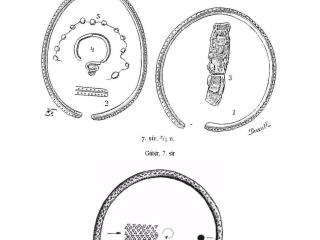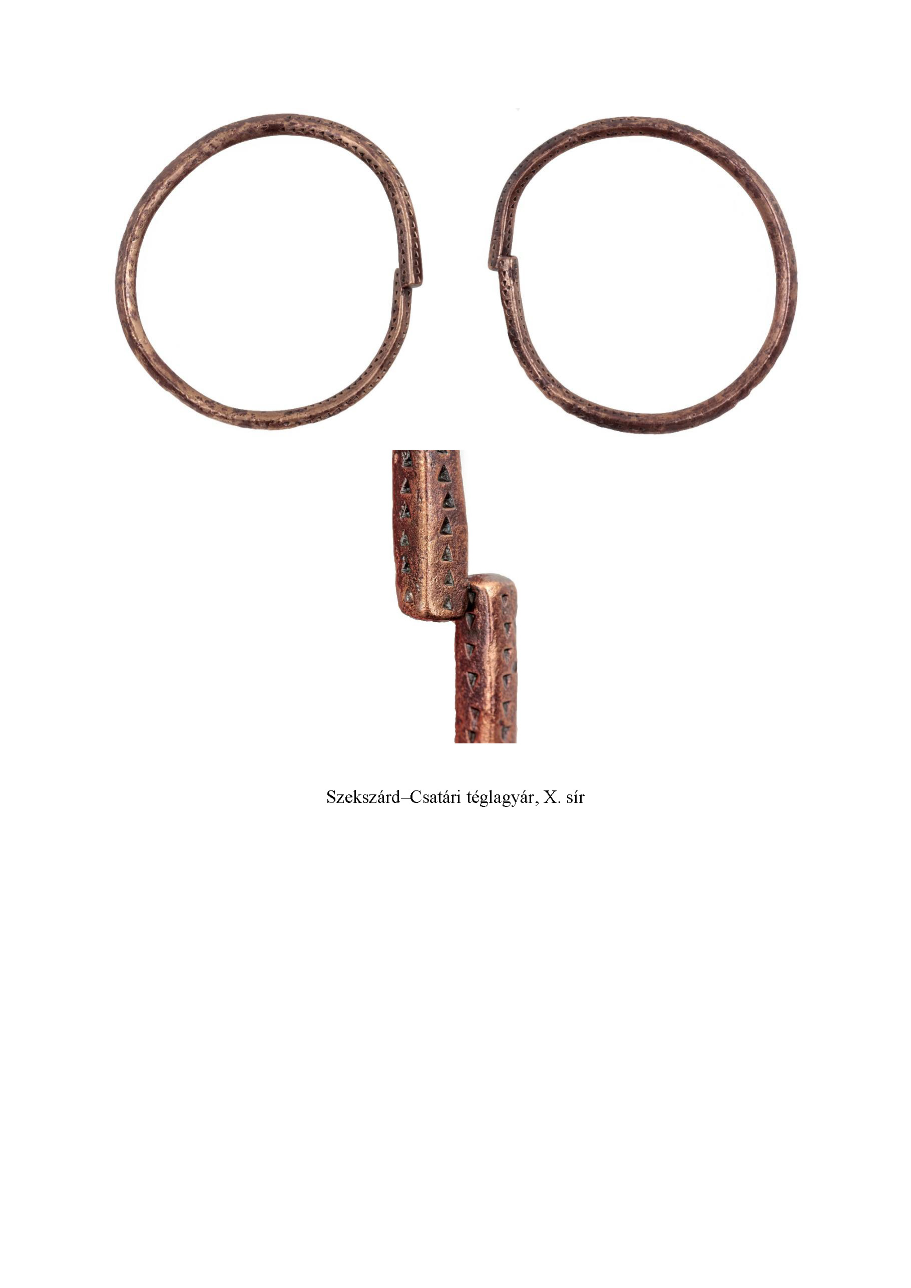 Mindkét karperecet taplószerű, vékony barna réteg vette körül. Ez a foszlányokban megmaradt réteg helyenkint finom, hálószemes /rácsos/ textilminta lenyomatát viseli magán. Lenszövés mintájának látszik…”