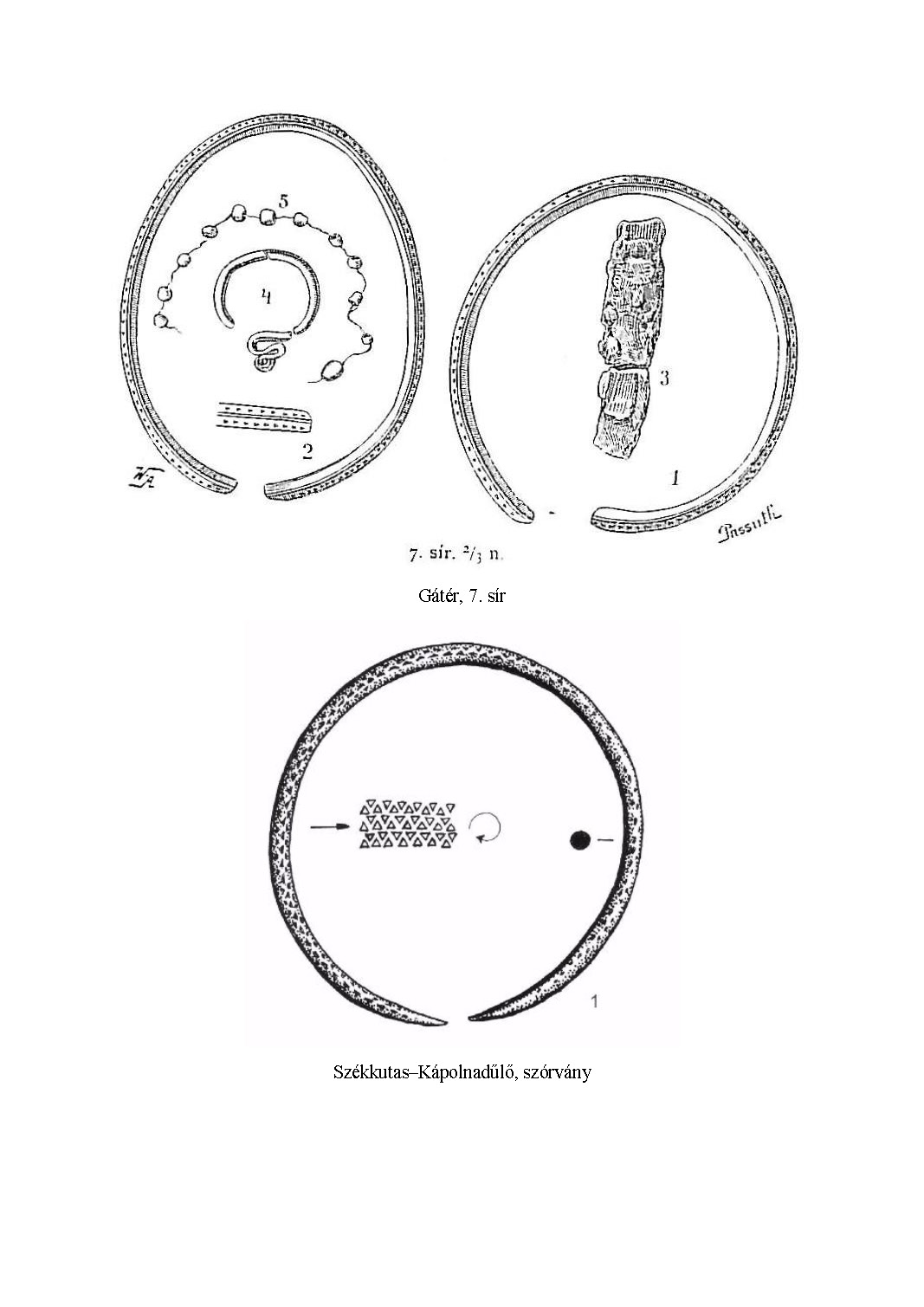 „Női sír. A váz hanyatt fekvő, a koponya felöli része bolygatott. Legalábbis erre következtethetünk abból a jelenségből, hogy a koponya nem fekszik a gerinc tengelyében, hanem attól balra 20 cm-re. Azonkívül a koponya arci része roncsolt és hiányos, végül 18 cm-rel magasabban fekszik, mint a váz többi bolygatatlan része, tarkóval felfelé.