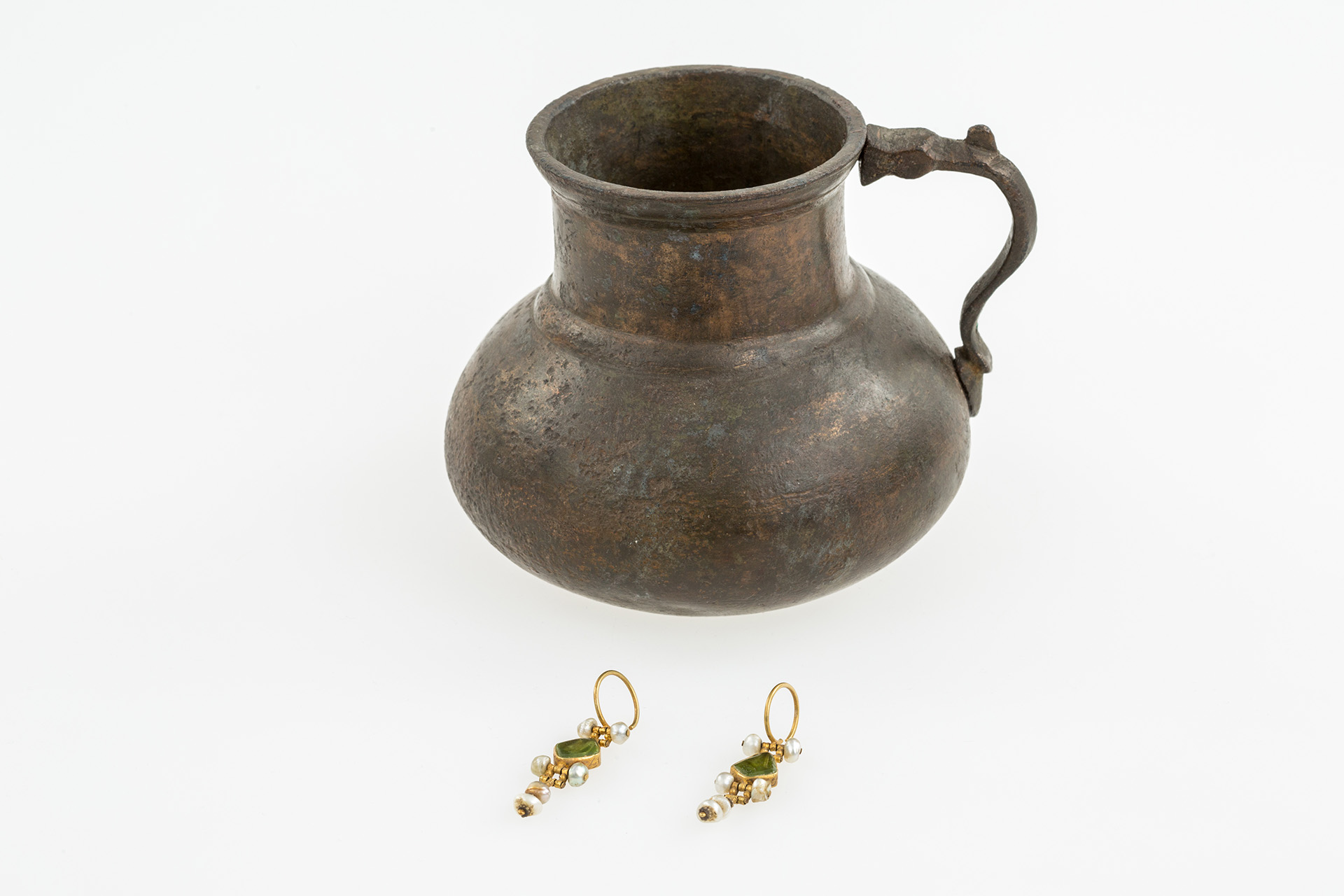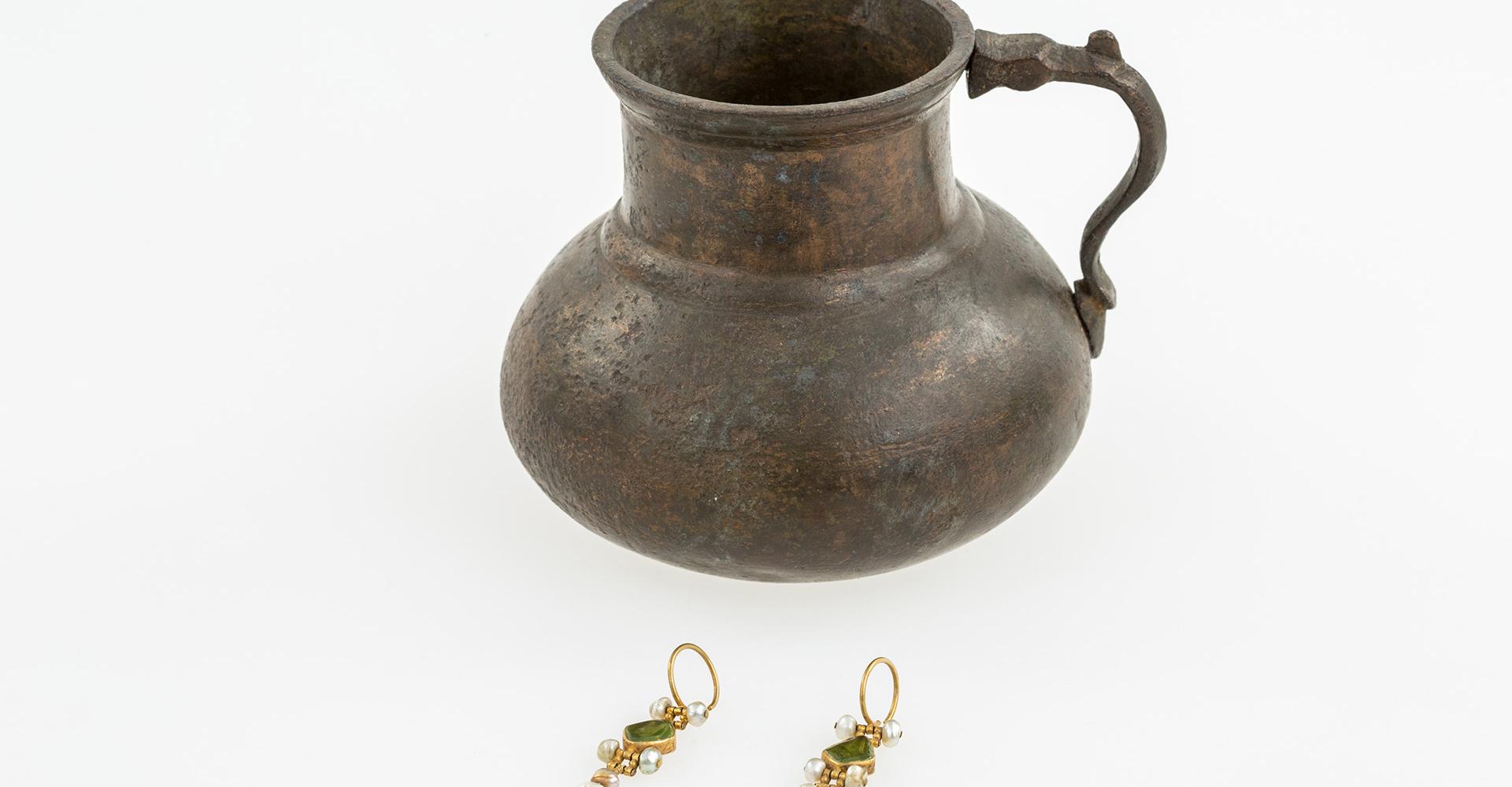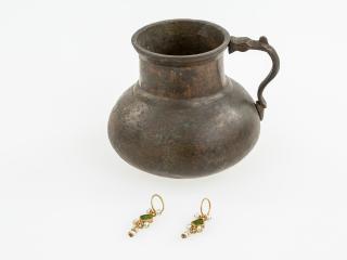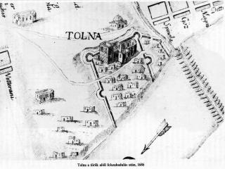 augusztus 1942-ben talált kincslelet Tolnáról   A Tolnamegyei Újság 1942 július 15-i száma arról számolt be, hogy a tolnai Merk Mihály a Fürdőház utca 6. számú ház udvarán gödröt ásott és bronz kancsót talált, melyben arany fülbevalópár volt. A fülbevalókat rombusz alakú zöld kővel (feltehetően smaragddal) ékítették, valamint darabonként hat-hat db igazgyönggyel. A kőberakás hátoldalára szegfűvirágokat karcoltak be. Az edény talán a találáskor sérült meg, de mindhárom tárgy hiánytalanul jutott be a szekszárdi múzeumba, ahol Csalog József nyilvántartásba vette, majd a lelet szerencsésen túlélte a második világháború viszontagságait is. A találó és a telektulajdonos 1050 pengőt kapott, Csalog első nyilatkozatában 1541-re, Tolna török elfoglalásának idejére keltezte a kincset. Ezt követően a lelet tudományos feldolgozása nem történt meg. A nyomott félgömbtestű, sematizált állatfejes végű fogantyúval ellátott réz kancsó a török rézedények egyik ritkább típusába tartozik. A kancsó formájának eredetét mutatja egy I. Szülejmán tugrájával (kalligrafikus névjegyével) ellátott ezüst kancsó. Rézből a Balkánon és a hódoltság területén az egész török időszak alatt, a 16. század második felétől kezdve megtalálhatók párhuzamai. A Nemzeti Múzeum gyűjteményében a tolnaihoz hasonló darabok több lelőhelyről ismertek, ezek nagyobb része kiöntővel és fedővel ellátottak. A kancsó fül nélküli legjobb párhuzama Felsőszentivánon (Bács-Kiskun megye), egy 16. századra jól keltezhető tallérlelet részeként bukkant elő. Arany fülbevalók a 16-17. századból viszonylag kis számban maradtak fenn, elsősorban nemesi gyűjtemények részeként jutottak múzeumokba. A csüngős, akár a sok csüngős szerkezet gyakori az időszakban és a smaragddíszítés is több darabon megtalálható (például a Nemzeti Múzeum Jankovich-gyűjteménye 183. leltári számú példányán). A fülkarika alatti kétgyöngyös díszítés általánosnak mondható a 17. századi darabokon. Ritka viszont az ékkőbetét duplazsanéros rögzítése, ahogy a foglalat hátlapjának karcolásos díszítése is. Növényi ornamentikát karcolt formában többfajta tárgyon is megfigyelhetünk a korszakból. A szegfűs motívum a 16. század utolsó negyedétől tűnik fel közép-európai ötvösműveken, leggyakrabban ezüsttárgyak, például poharak szájpereme alatti véséseken látható. A Tolna, Malom utcai kincslelet egyik ezüstpoharának perem alatt körbefutó bimbózó virágdíszítése jó példa erre. Egyes esetekben a véseteket beágyazott zománc díszítette, a tolnai darabon nincs zománcra utaló nyom. Az ékszerek Közép-Európában, nagy valószínűséggel a Magyar Királyság területén készülhettek. A Tolna, Fürdőház utcai fülbevalók szerkezeti szempontból legjobb párhuzama a dombóvári Gólyavár 2016. évi ásatásán került feltárásra a várárok 17. század végi - 18. század eleji feltöltéséből. A még publikálatlan fülbevaló a tolnaihoz hasonló méretű, hasonló szerkezetű, de kerek formájú foglalatba helyezett kőberakásos, ugyancsak duplazsanéros, és hasonló technikával készítették az igazgyöngy díszű csüngőit (a dombóvári példány kétcsüngős). A Tolna, Fürdőház utcai edényt párhuzamai inkább a 16. század második felére, a fülbevalókat pedig a 17. század elejére keltezik. A kincset legnagyobb eséllyel a két század fordulóján, a 15 éves háború idején rejtette el egykori tulajdonosa. A lelet városon belüli elhelyezkedése szintén említésre méltó, hiszen Tolna közép- és török kori városmagjában foglal helyet. A városmag beazonosításához az okleveles adatokon kívül elsősorban 17. század végi térképekre és néhány 19-20. századi leletleíráshoz kell folyamodnunk. A megye névadó településének ispánsági földvárát és főesperesi templomát Szent István emeltette. Az Árpád-korban ezt a két objektumot még egy plébániatemplom egészítette ki. Feltehetően a földvárat a középkor folyamán kőfallal vették körül, amelyet a 14. század elején megostromoltak. Az 1686-ban készített ábrázolás alapján négyzet alaprajzú volt a vár, sarkain, illetve a bejáratoknál félkör alakú bástyákkal megerődítve. A vártól északkeletre egy rövidebb külső várfal szakasz van. A vár északnyugati felében egy nagyobb, kereszthajós, köríves szentélyzáródású, templom alapfalai látszanak. A váron kívül egy-egy kisebb kőépületet, talán templomokat ábrázoltak. A középkori vár legvalószínűbb helye a régészeti leletek szóródása alapján a Selyemgyár északi részén, illetve a Fürdőház utca déli szakaszán keresendő. A plébániatemplomnak, amely a váron belüli építménnyel azonosítható, Szent István volt a védőszentje. Egy török kori leírás szerint toronyórája is volt, amelyet éppen reparáltak. A vártól északnyugatra elhelyezkedő épület lehetett a Szent Bertalannak dedikált kápolna. 1647-ben leírták a kápolnáról, hogy a lutheránus vallás győzelme után a katolikusoknak megengedték, hogy az épület mellé temetkezzenek. 16. századi török leírások Szent Iván (István?) és Boldogasszony templomok birtokairól értekeznek. Ezek egyike lehetett a vártól délnyugatra álló épület, a másik pedig a Duna túloldalán lévő Kis-Tolna településrész kápolnájával azonosítható. A török korban a várat még használták. A belvárosban karavánszeráj, kisebb dzsámi és fürdő is volt. Régészeti szempontból jelentősebb kőépület lehetett még a városháza, a lelkészlak, valamint a 16. század második felében jelentős református középiskola. A középkorban, sőt a török kor első felében virágzó Tolna fejlődésének a 15 éves háború vetett v