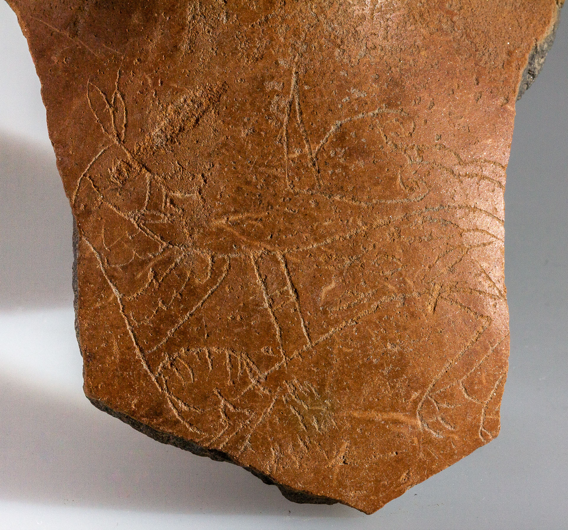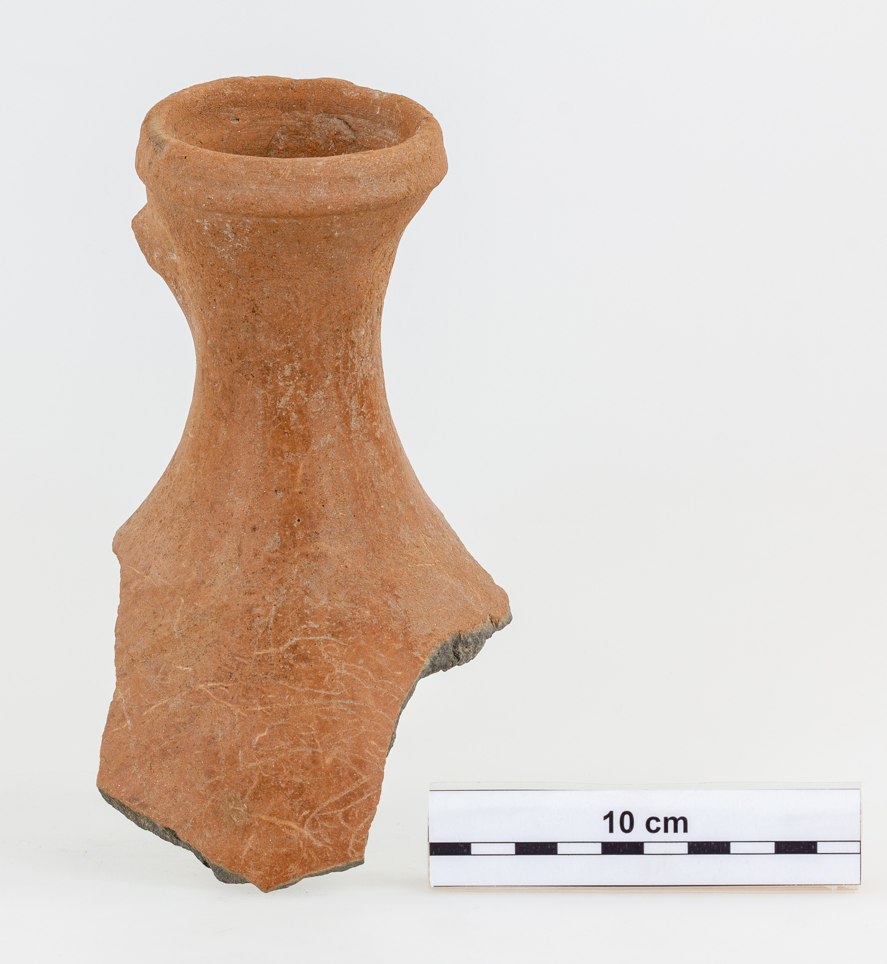 Leírás: Kancsó felső részének töredéke. Sötétszürke agyagból készült, homokkal, csillámmal soványított, felülete vörösre égett. Kerek száj, egyenes, felül legömbölyített peremmel. A perem 1 cm szélességű, amelyen egy enyhe horony fut körbe. A perem alsó széle megvastagított. A perem alól indult az ovális átmetszetű fül (letörött). A perem alól tölcséresen szűkül a nyak, majd erőteljesen szélesedik. A nyakon megfigyelhető, hogy a felületet fényesre sikálták. A has gömbös lehetett, csak egy töredék maradt belőle. Ezen a darabon egy bekarcolt lóábrázolást láthatunk. A ló fejét hátrafordítja, szája nyitott. A testén szíjazatok vannak. Mellső lábából csak a combrész maradt meg – hátsó része is hiányos az edény töredékessége miatt, a lórajzból a fara hiányzik, hátsó lábaiból a pata látszik. A farok a háta felett a felcsapva, egy szabályos levélmotívumot formáz.