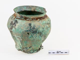 Itáliai eredetű bronzserpenyő Faddról   Régészeti gyűjtemény, leltári szám: 2022.3.1. Méret: teljes hossz: 49 cm, a serpenyőrész átmérője: 25 cm, magassága: 7 cm Lelőhely: Fadd-Falufeletti-dűlő   A Wosinsky Mór Megyei Múzeum közösségi régészeti programjában részt vevő faddi múzeumbarát fémkeresősök, Borda Attila és Borda Bálint találták a serpenyőt tartalmazó leletegyüttest. Amikor azonban látták, hogy komolyabb tárgyakról van szó, akkor az együttműködési megállapodásban foglaltaknak megfelelően értesítették az intézményünket, így a feltárást már a találók segítségével a szöveg írója végezte. A viszonylag kis átmérőjű ovális alaprajzú gödörben legfelül egy kilyukadt, horpadt, vas füllel ellátott bronz vödör volt, ez alól került elő a szinte kettéhajtott serpenyő, illetve egy vas pajzsdudor. A leletek tisztítása során derült ki, hogy a vödörben további vasdarabok voltak, amelyek közül néhány egy pajzs peremének merevítő vasalatához tartozott, más összeillő darabokat kardhüvely töredékeiként azonosíthatjuk, de egy lándzsahegy köpűje is található közöttük. A hasonló jellegű régészeti objektumok alapján a feltárt jelenség a késő vaskori keltákhoz köthető úgynevezett La Tène kultúra hamvasztásos sírjaira emlékeztet, még annak ellenére is, hogy emberi hamvak egyáltalán nem kerültek elő. A leletek közül a legérdekesebb darab az itt bemutatott konyhai eszköz: ez a széles, lapos testű serpenyő, amely hosszú nyelének a közepén egy éles gerinc fut, a szélein pedig a testen is megfigyelhető vastagabb perem található. A peremet a nyéltőnél úgynevezett fenyőgallymintával díszítették. A nyél végén lévő jellegzetes visszahajló „hattyúfej” akasztóként is funkcionált. Az öntéssel, majd a serpenyőrész öblössé való kikalapálásával készült tárgy a látható állapotban került a földbe: nyelét elhajlították, a teste is torzult és kilyukadt. A szakirodalomban több néven (aylesfordi típus, Eggers 130. típus, Werner B-C típus, Radnóti 1. típus) ismert serpenyőt a párhuzamai alapján a kutatás észak-itáliai készítésűnek tartja, s használatát a Kr. e. 1. századra teszi. Az őshazájukból Európa szerte történő szétrajzásuk során a Kárpát-medencébe a Kr. e. 4. század folyamán nyugatról betelepedő kelták folyamatos kereskedelmi kapcsolatban voltak a Mediterráneummal, így az egyre terjeszkedő, birodalmat építő Rómával is. Az itáliai eredetű serpenyőnk is bizonyítja mindezt, mert legalább egy évszázaddal korábban került a Dunántúlra, mint ahogy azt a Római Birodalom megszállta volna. A párhuzamok alapján a feltárt objektumban talált másik bronzedény is, az úgynevezett bargfeldi típusú vödör is Itáliában, Aquileia térségében készült. A szóban forgó faddi leletekkel kapcsolatosan felmerülhet a kérdés, hogy mi a köze egymáshoz a konyhai eszközöknek és a fegyvereknek, miért is kerültek ezek együtt a földbe. Más, hasonló összetételű leletegyütteseket (például egy véméndi sír) és az írott forrásokat tanulmányozva kiderül, hogy mind a serpenyő, mind a vödör a katonák felszerelési tárgyai közé tartoztak. Így azt mondhatjuk, hogy a bemutatott tárgy egy kelta harcos főzőedénye volt, amely a többi tárgyaival – a folyadékok tárolására szolgáló vödörrel, a pajzsával, a kardjával és a lándzsájával – együtt került a Duna hajdani ártere fölé magasodó dombvonulaton megtalált valóságos vagy jelképes sírjába.   Felhasznált irodalom Eggers, Hans Jürgen: Der römische Import im Freien Germanien. Hamburg 1951. Hunyady Ilona: Kelták a Kárpát-medencében. Budapest 1942. Radnóti Aladár: A pannóniai római bronzedények. Budapest 1938. Szabó Klára: Bronzipar. In: Pannonia régészeti kézikönyve. Szerk. Mócsy András – Fitz Jenő. Budapest 1990, 130–151.   Szöveg: Czövek Attila Fotó: Retkes Tamás