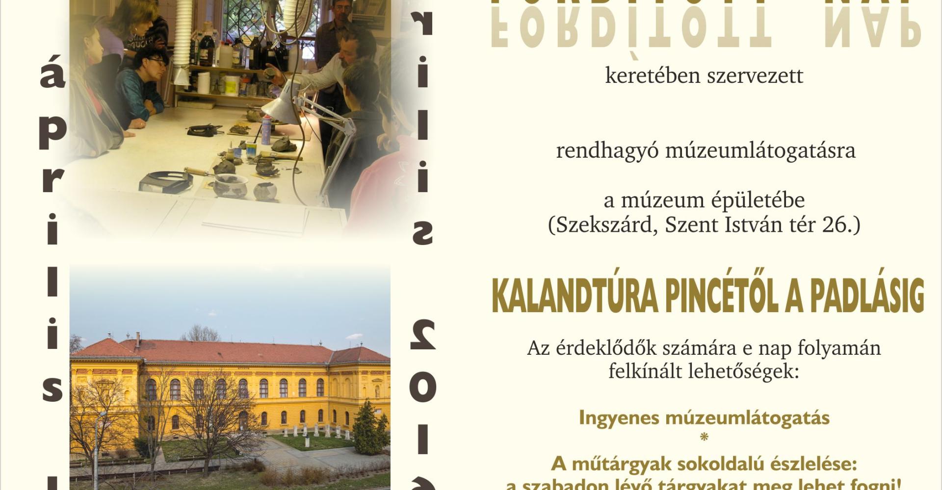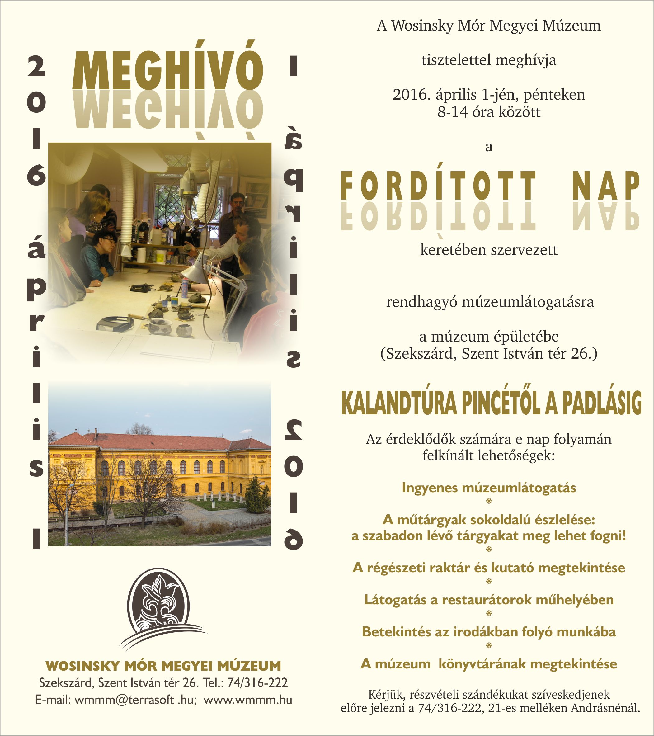 Szeretettel várjuk az érdeklődő csoportokat az április 1-jén szervezett Fordított napra. A résztvevők ezúttal a múzeum látogatók elől elzárt területeivel – padlással, restaurátorok műhelyével, régészeti kutatóval, szakkönyvtárral – ismerkedhetnek. Részletek a csatolt meghívóban olvashatók. A csoportokat 8-14 óra között minden egész órában fogadjuk. Előzetes bejelentkezést a 74/316-222 telefonszám 21-es mellékén kérünk.   Üdvözlettel:   Andrásné Marton Zsuzsa múzeumpedagógus MOKK megyei múzeumi koordinátor   Wosinsky Mór Megyei Múzeum 7100 Szekszárd, Szent István tér 26. Tel/fax: 74/316-222, 21-es mellék Mobil: 06-20/3912-412 E-mail: anzsu@wmmm.hu
