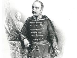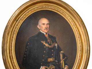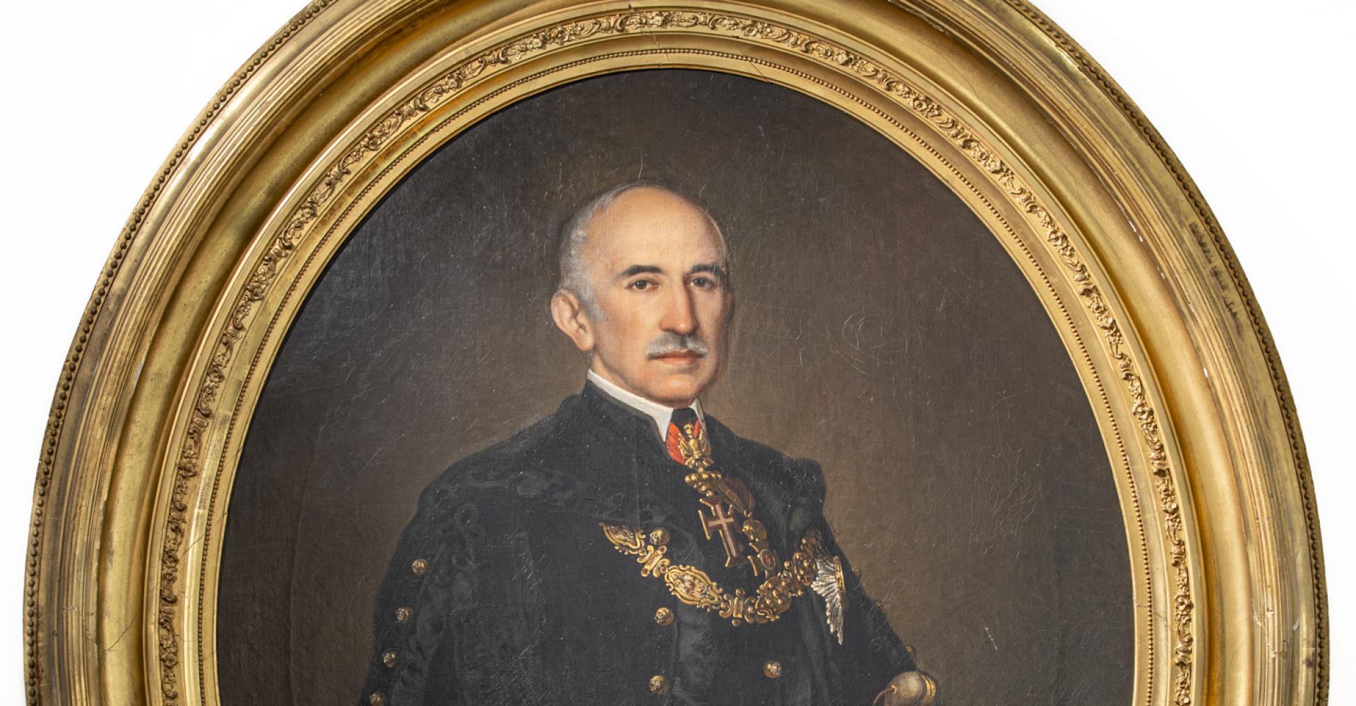 Leírás: Sötét háttér előtt idős, ősz hajú és bajuszú férfi háromnegyed alakja látható. Aranygombos fekete díszmagyar felett ékkövekkel kirakott, aranyozott mentekötő láncot és övet visel. Jobb kezében fekete tollas csákó gyöngyökkel, csüngőkkel ékesített tollforgóval. Bal kezében díszes kardot tart. Nyakában vörös szalagon a Krisztus-rend keresztjét viseli, bal mellén a Szent István-rend keresztje és csillaga látható.