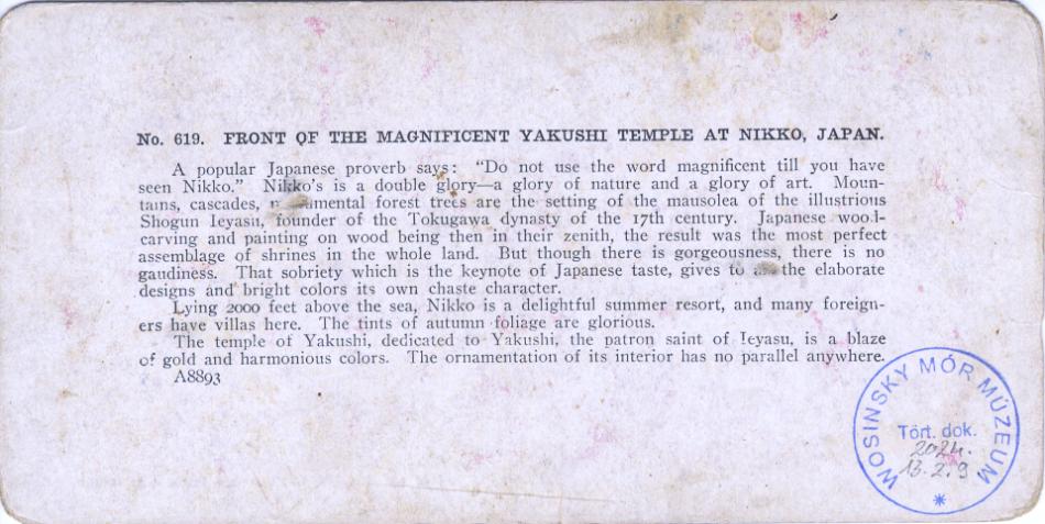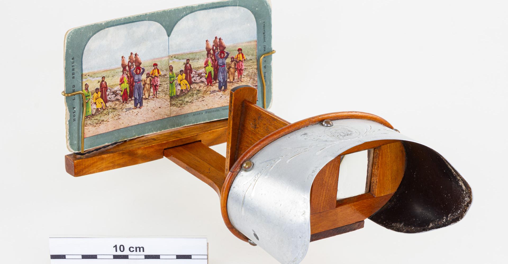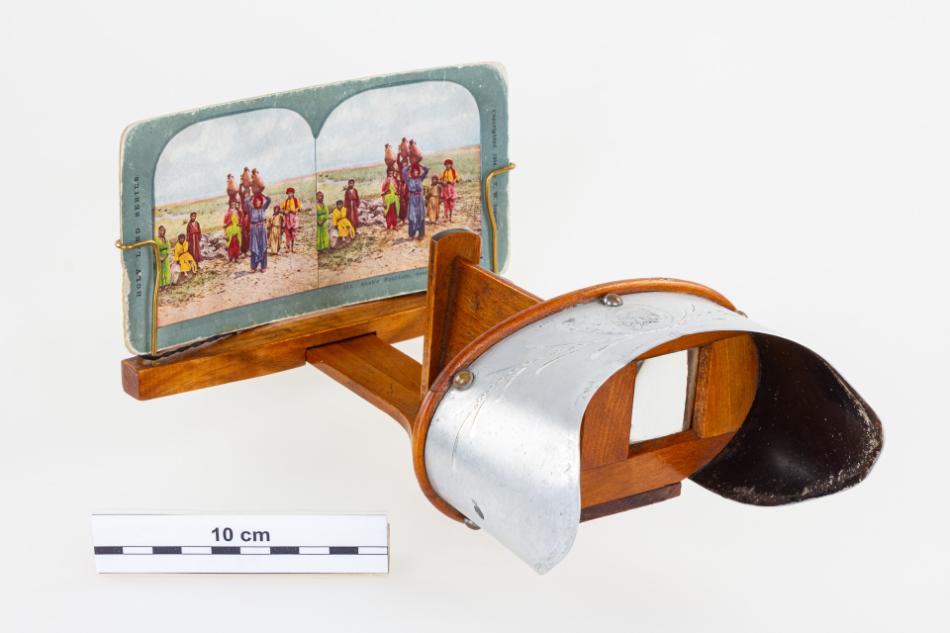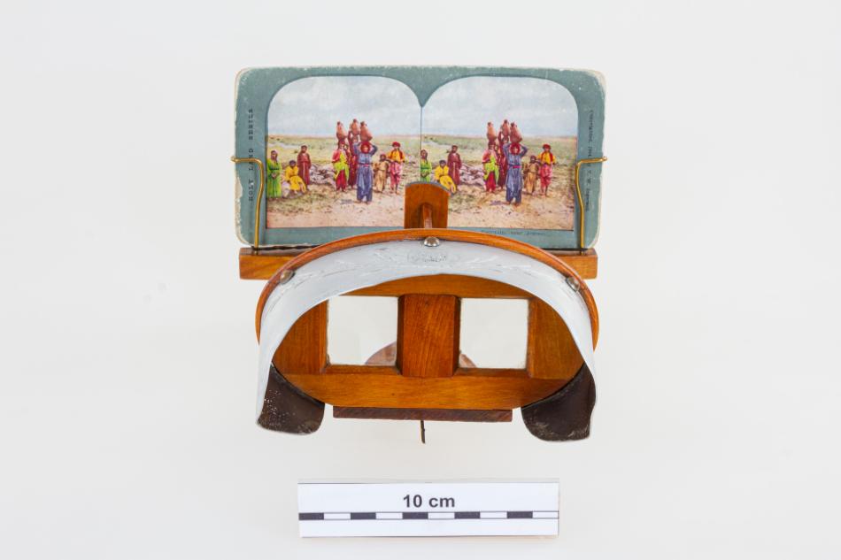 A sztereoszkóp 2024 áprilisában Molnár Ernő Imrénétől (szül. Popovich Erzsébet, 1942), vétel útján került a múzeum újkortörténeti gyűjteményébe 251 db sztereofotóval. A készüléket a hozzá tartozó képekkel édesapjától örökölte. A „panorámázás” – ahogy a képnézegetést a századelőn emlegették – mindkettőjük legkedvesebb gyermekkori elfoglaltságai közé tartozott, amely gyakran került elő társasági körben is. A készülék vélhetően a századforduló éveiben kerülhetett a család tulajdonába. A sztereoszkóppal járó 251 db színes sztereo fényképpárt zömében az amerikai T. W. Ingersoll cég gyártotta. A sorszámozott és zöld színnel keretezett képsorozatok döntően három téma köré csoportosíthatók. A gyűjtemény a Távol-Keletet (Japánt), illetve a Közel-Keletet (a Szentföldet, továbbá bibliai eseményeket és helyszíneket) bemutató képciklusok mellett a korabeli gyermekéletet megjelenítő sorozatot is tartalmaz. Az előlapon, egyik-másik fotó mellett a kiadás éve (1898–1905-ig) is látható, a felvételeket készítő fotográfus(ok) neve azonban nincs feltüntetve. A képpárok hátoldalán a témához kapcsolódó hosszabb-rövidebb angol nyelvű magyarázó szövegek olvashatóak.