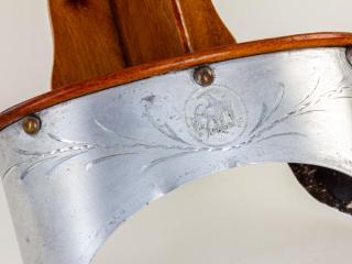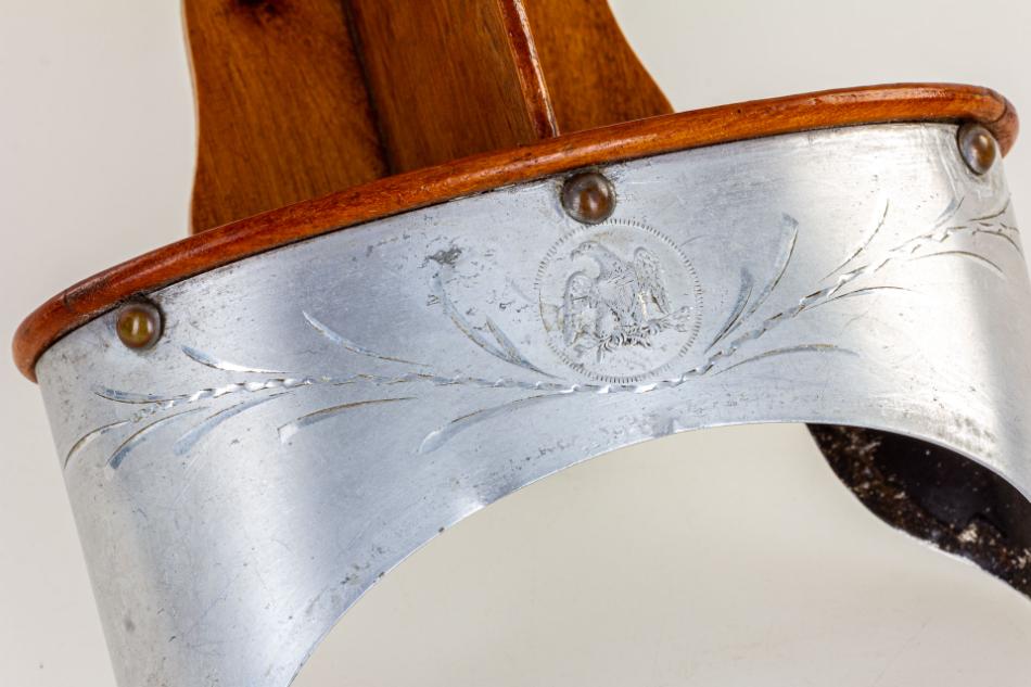 Sztereoszkóp: lakkozott puhafából készült lencsés sztereofénykép-néző szerkezet. A lencse ovális keretlapját egy ívesen hajló alumínium lemez veszi körbe, amelyet felül aprólékos, vésett motívumok díszítenek. Középen egy – fejét oldalra fordító – sasmadaras embléma látható. A fémlemez peremét vélhetően bőrrel vagy valamilyen anyaggal (bársony) szegélyezték. A sztereonéző készülék hosszan előrenyúló lapján egy keresztirányban csúsztatható fényképtartó „sín” került elhelyezésre. A készülék fogantyúja alul hiányzik, annak csupán rögzítőpántja látható.